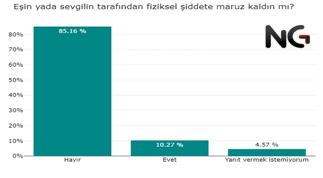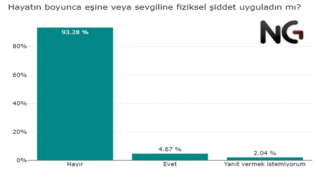 Katılımcıların %93'ü eşine veya sevgilisine fizikşel şiddet uygulamadığını belirtti. Kadınların %12’si eşinden veya sevgilisinden hayatında en az bir defa fiziksel şiddet gördüğünü belirtirken fiziksel şiddet uyguladığını belirten erkeklerin oranı yalnızca %5. Aradaki bu fark akıllara farklı sorular getiriyor. Fiziksel şiddet uygulayan erkek bunu itiraf etmek istemiyor olabilir mi?