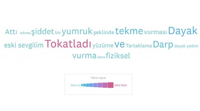 Fiziksel şiddete uğrayanların cevaplarından oluşturulan sözcük bulutu Fiziksel şiddete maruz kalan her 20 kişiden yaklaşık 6'sı bunu kimseye söylemiyor. Her 20 kişiden yaklaşık 8'i ise anne, baba ve kardeşi gibi 1.dereceden akrabalarıyla bu durumu paylaşıyor. Aileden sonra en çok paylaşılanlar ise polis, mahkeme gibi devlet kuruluşları.Fiziksel şiddete maruz kalanların, bunu engellemek için neler yapabileceğini ve nerelerden destek alabileceğini biliyor musun?