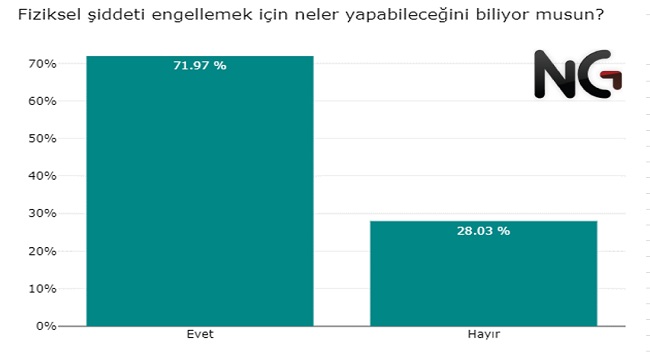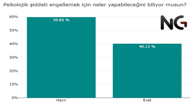 Her 10 kişiden 6’sı psikolojik şiddeti nasıl engelleyeceğini ve böyle bir durumda nereden yardım alacağını bilmiyor. Fiziksel şiddete oranla daha çok psikolojik şiddete maruz kalınmasına rağmen, nasıl bir çözüm bulunacağı ve neler yapılabileceği hakkında daha az bilgiye sahip olduğumuz görülüyor.