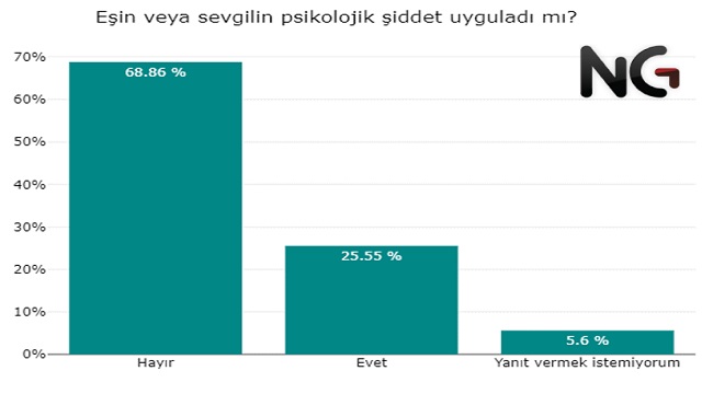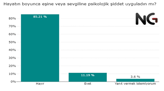 Eşine veya sevgiline psikolojik şiddeti sen uyguluyor musun diye baktığımızda karşımıza yine ilginç bir tablo çıkıyor. Kadınların %37'si hayatında en az bir defa psikolojik şiddet gördüğünü belirtirken, psikolojik şiddet uyguladığını belirten erkeklerin oranı yalnızca %10.Erkeklerin %12’si eşinden veya sevgilisinden hayatında en az bir defa psikolojik şiddet gördüğünü belirtirken, psikolojik şiddet uyguladığını belirten kadınların oranı %12.