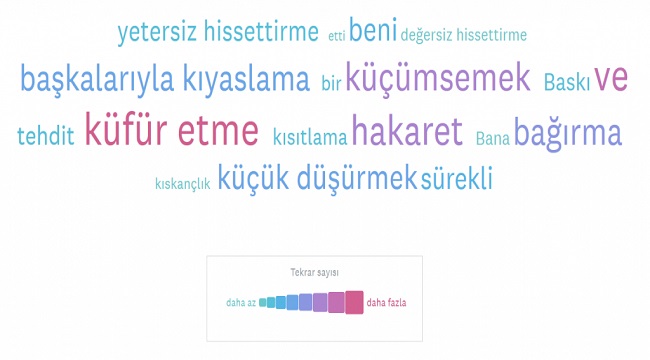 Psikolojik şiddete uğrayanların cevaplarından oluşturulan sözcük bulutu Psikolojik şiddet görenlerin %28'i bundan kimseye bahsetmezken, %31'i yakın arkadaşlarıyla paylaşıyor. %25'lik kesim ise durumu ailesine anlatıyor.