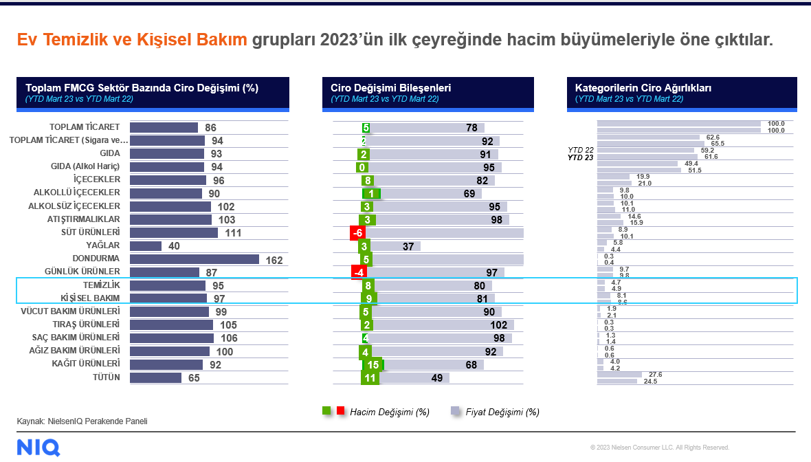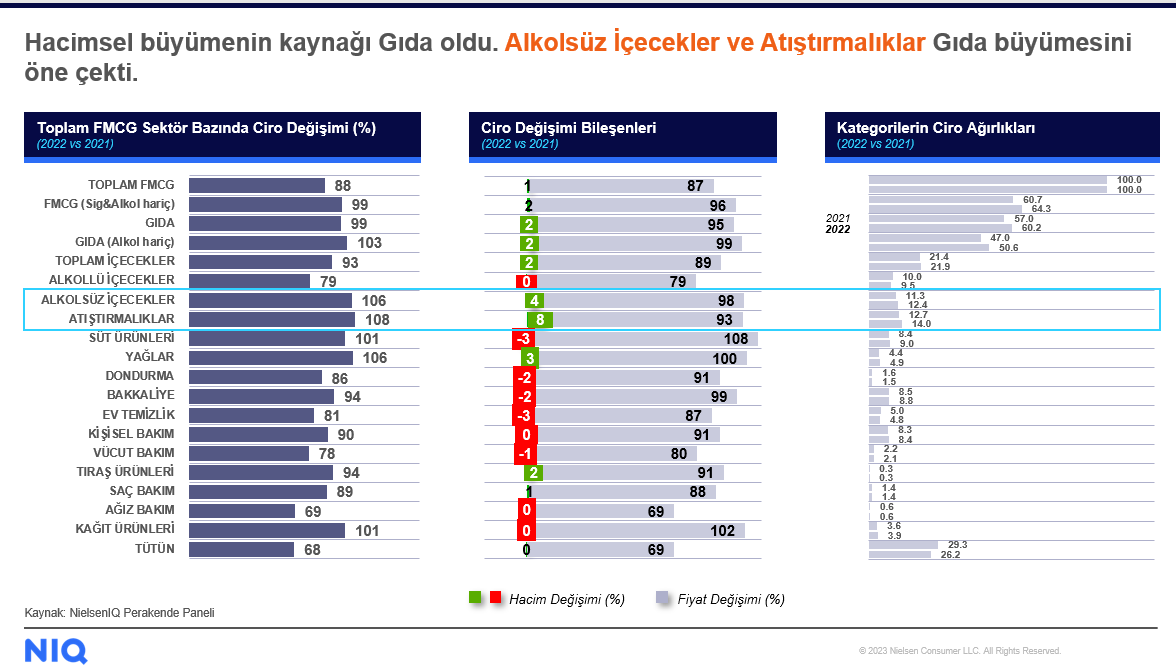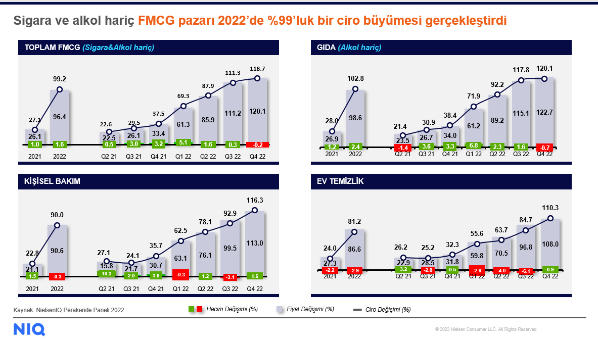 - NielsenIQ Türkiye Genel Müdürü ve Afrika & Orta Doğu Analitik Başkan Yardımcısı Didem Şekerel Erdoğan, Türkiye’de FMCG (Hızlı Tüketim Ürünleri) perakendesinin 2022 yılı toplamında %99 büyüme kaydettiğini paylaştı. Didem Şekerel Erdoğan, hacimsel olarak daralma yaşayan dünya FMCG pazarıyla kıyaslandığında, Türkiye’nin diğer ülkelerden pozitif biçimde ayrıştığını vurguladı.