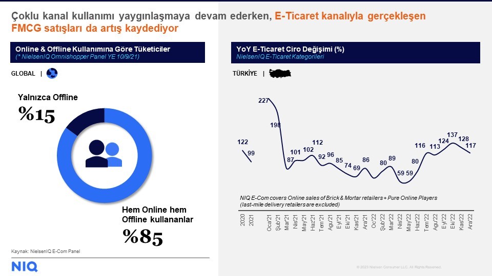 NielsenIQ Türkiye Müşteri Hizmetleri ve E-Ticaret Direktörü Yankı Yalçın, e-ticaretin bu güçlü bazına rağmen 2022 yılı toplamında %100’lük bir ciro büyümesi kaydettiğini; büyümenin özellikle son aylarda ivme kazandığını belirtti.