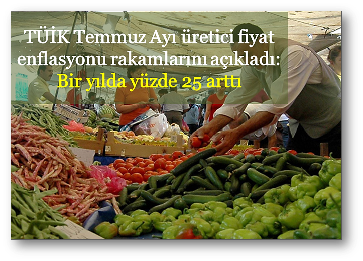 Türkiye İstatistik Kurumu, Temmuz Ayı Yurt İçi Fiyat Endeksini açıkladı. Açıklanan rakamlara göre : Yurt içi üretici fiyat endeksi (Yİ-ÜFE), 2018 yılı Temmuz ayında Haziran ayına göre %1,77, bir önceki yılın Aralık ayına göre %17,56, bir önceki yılın Temmuz ayına göre %25 ve on iki aylık ortalamalara göre %17,41 artış gösterdi. Yıllık en fazla artış enerjide gerçekleşti.