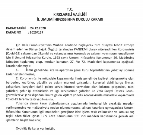 Kırklareli Valiliği İl Umumi Hıfzıssıhha Kurulu'nun aldığı kara göre bazı meslek grupları ile şehre dışarıdan gelenlerin koronavirüs testi yaptırması zorunlu hale getirildi.Kırklareli Valiliği İl Umumi Hıfzıssıhha Kurulu Kararı