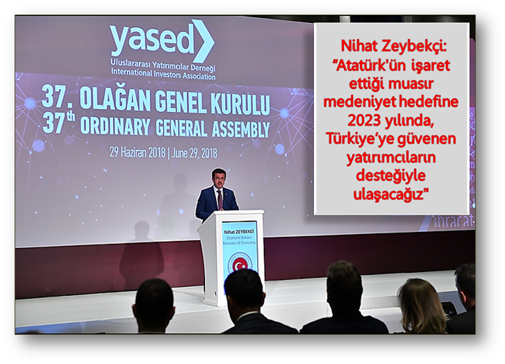 YASED Uluslararası Yatırımcılar Derneği’nin 37’inci Olağan Genel Kurulu, ekonomi bakanı Nihat Zeybekci’nin katılımıyla bugün İstanbul’da gerçekleştirildi. Bakan Zeybekci, Genel Kurul’un açılışında yaptığı konuşmada, “ Gazi Mustafa Kemal Atatürk ' ün işaret ettiği muasır medeniyet hedefine 2023 yılında, Türkiye’ye güvenen yatırımcıların desteğiyle ulaşacağız. Pazar günü yapılan seçimlerle geçiş yaptığımız yeni sistem bu hedefimize ulaşmaya bizi bir adım daha yakınlaştıracaktır ” dedi.YASED Başkanı ahmet erdem ise “Yeniden Cumhurbaşkanımız seçilen Sayın Recep Tayyip Erdoğan’ı ve 27. Dönem Milletvekili olarak seçilen tüm adayları kutluyoruz, yeni dönemin ülkemize ve milletimize hayırlı olmasını diliyoruz.Bu yeni dönemde, ülkemizin ihracat hacminin arttırılmasında, bölgesel bir yatırım merkezi olarak konumlandırılmasında ve sürdürülebilir ekonomik büyümesinde çok önemli bir katkıya sahip olan uluslararası doğrudan yatırımları artıracak politikaların öncelikli olması, ülkemiz için her zamankinden çok daha önemlidir. Bu anlamda, yased olarak yatırım ve iş ortamımızın uluslararası doğrudan yatırım açısından cazibesi ve verimliliğinin arttırlmasına katkıda bulunmaya devam edeceğiz ” dedi.
